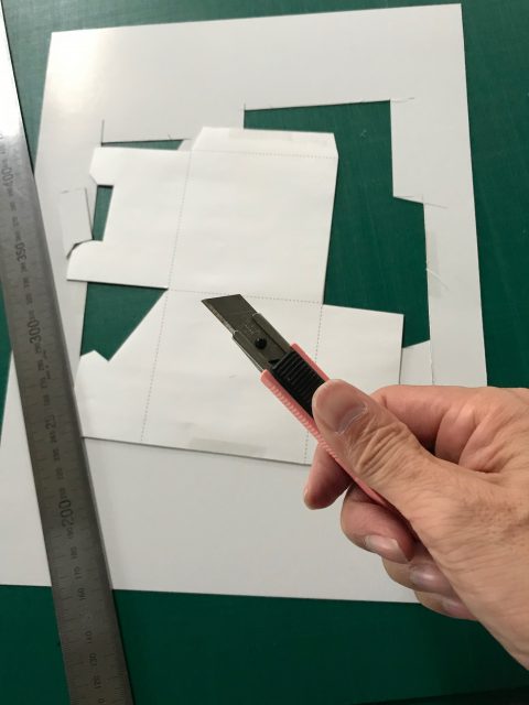 3.型紙に沿って、スチール定規を当て、厚紙をカッターナイフでカットします。