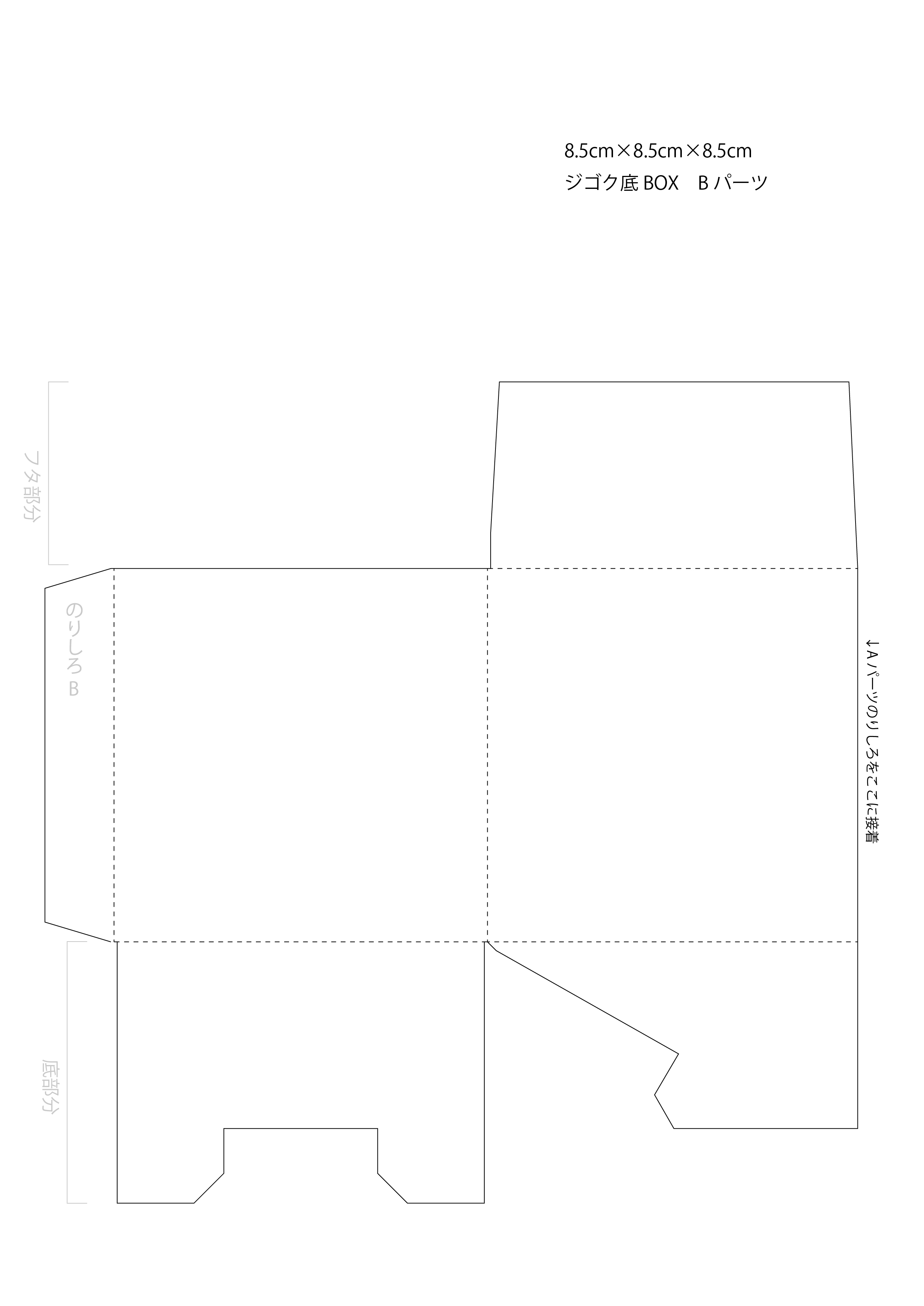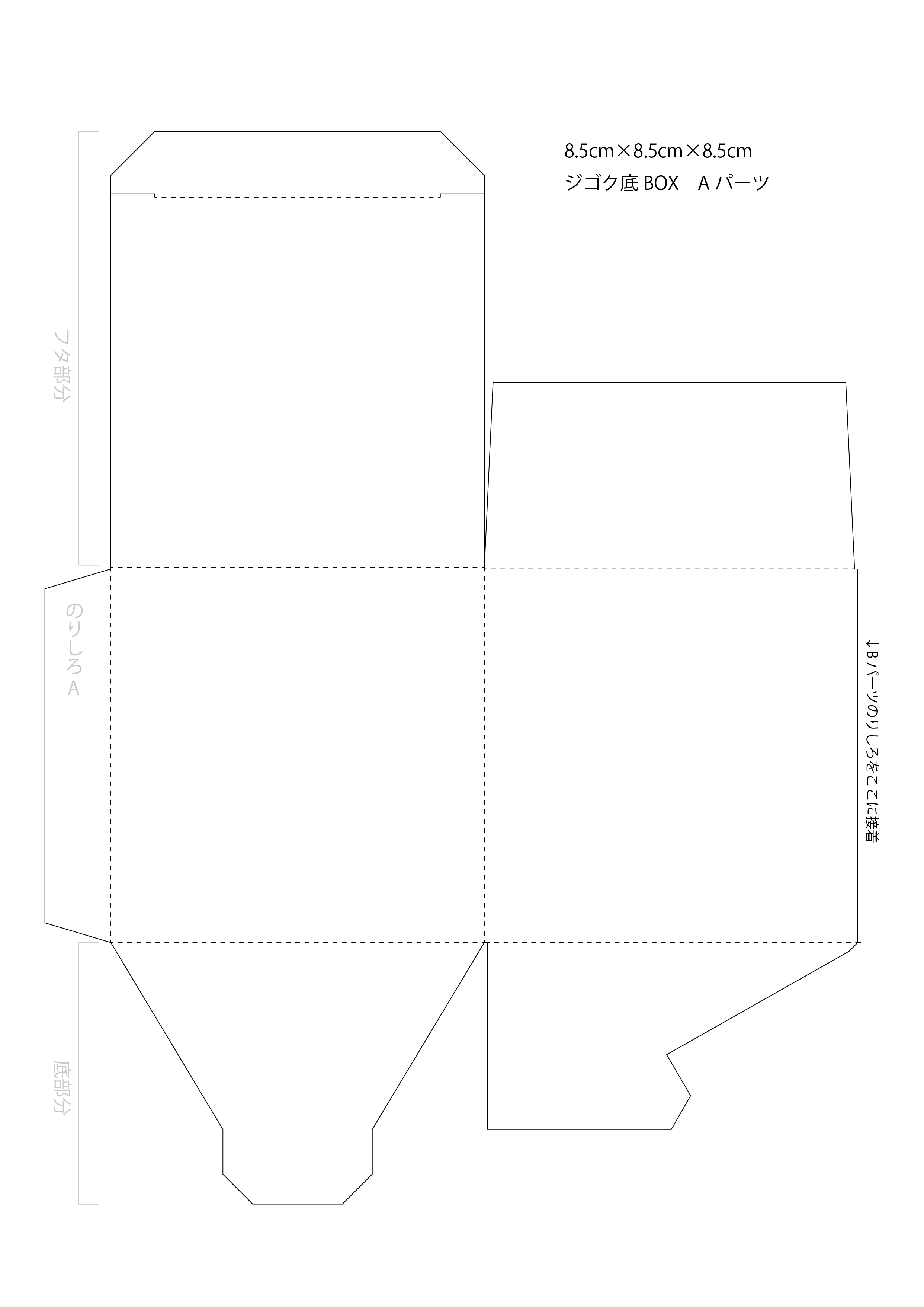 AパーツとBパーツの2つをA4サイズでプリントすると、8.5cm×8.5cm×8.5cmの地獄底の箱を作る図面になります。